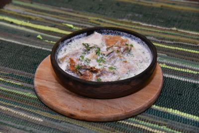 Скумбрия, лук репчатый, перец острый, кинза, чеснок, уксус винный белый, перец чёрный горошком, лавровый лист, соль Гоми — густая кукурузная каша с сыром сулугуни; Печень, желудочки, жаренные с луком и … Долма — баранина в виноградных листьям со сливочным соусом;