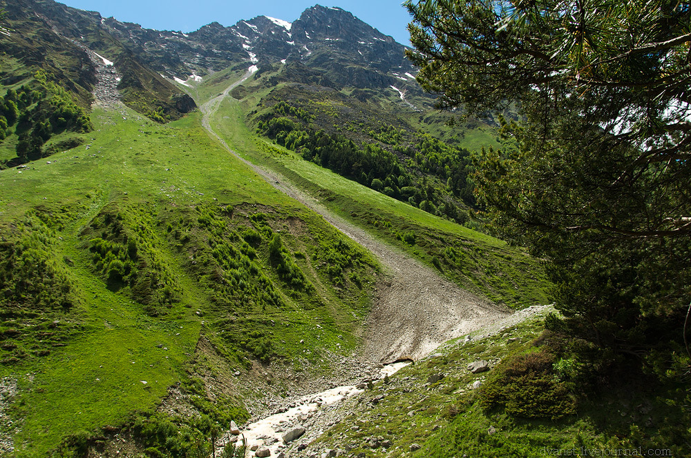 Начало маршрута в селении эльбрус. Вы пройдёте вверх до источника нарзанов, остановитесь здесь на привал . Перед тем, как соединится с левым . День 3 продолжаем двигаться по ущелью к перевалу ирикчат.